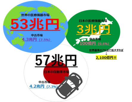 中古自動車市場は2020年―21年集計で約4.2兆円 市場全体からみた各中古市場の割合は、世界の医療機器市場で7.5% 日本の医療機器市場では0.6%。自動車市場では7.3%になっています。