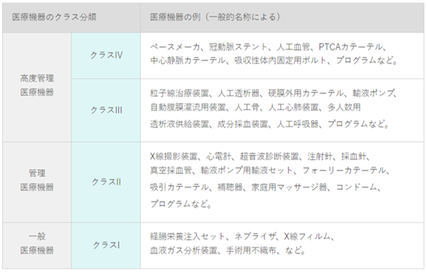 医療機器には様々な種類のものがあり、使用における安全上のリスクや目的や用途などの種別により分類されています。以下は医療機器のクラス分類と該当する製品例です。