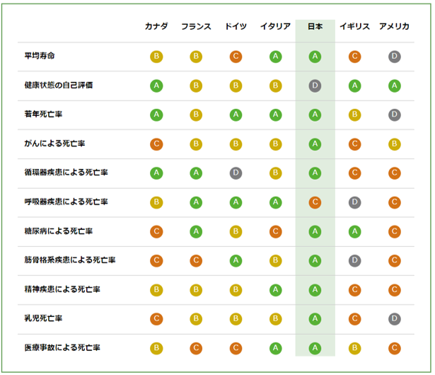少し古いデータですがカナダのシンクタンクConference Board of Canadaが調査作成した資料によると平均寿命のほか、死亡率(若年者、がん、循環器疾患、糖尿病、筋骨格系疾患、精神疾患、乳児、医療事故)などの項目でA評価を受け、