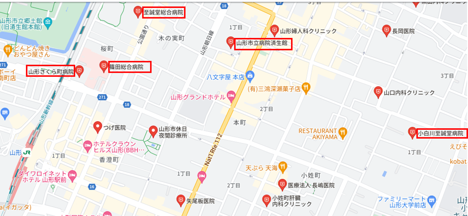 山形駅東口周辺には1kmの範囲に大きな病院が4つも密接しています。駅に近い順に紹介して行きます。