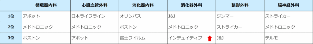 2.医師の印象に残っている医療機器メーカーのランキングでは「心臓血管外科」「消化器外科」が変化