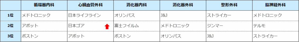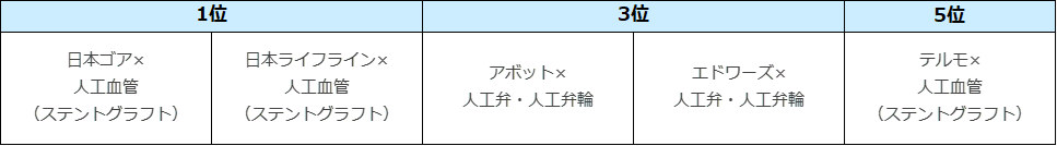 医師に印象に残っている医療機器メーカーと製品群の組み合わせを聴取したランキングでは、図2の医療機器メーカーランキングで変化のあった「心臓血管外科」で「日本ゴア×人工血管(ステントグラフト)」と「日本ライフライン×人工血管(ステントグラフト)」が1位でした。