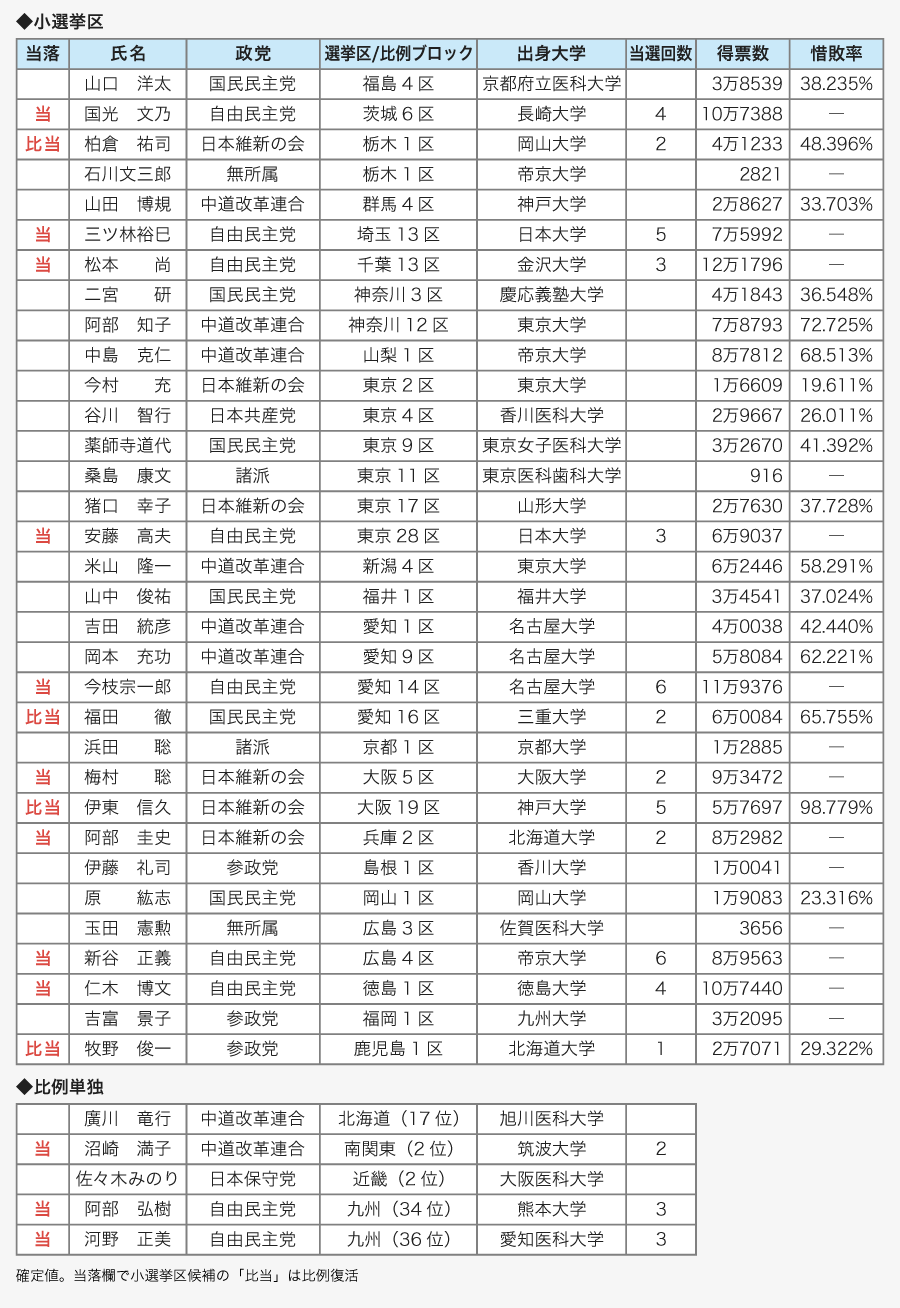 医師資格保持者の当選者は、前回の第50回総選挙では36人中17人、前々回の第49回総選挙では30人中12人だった。