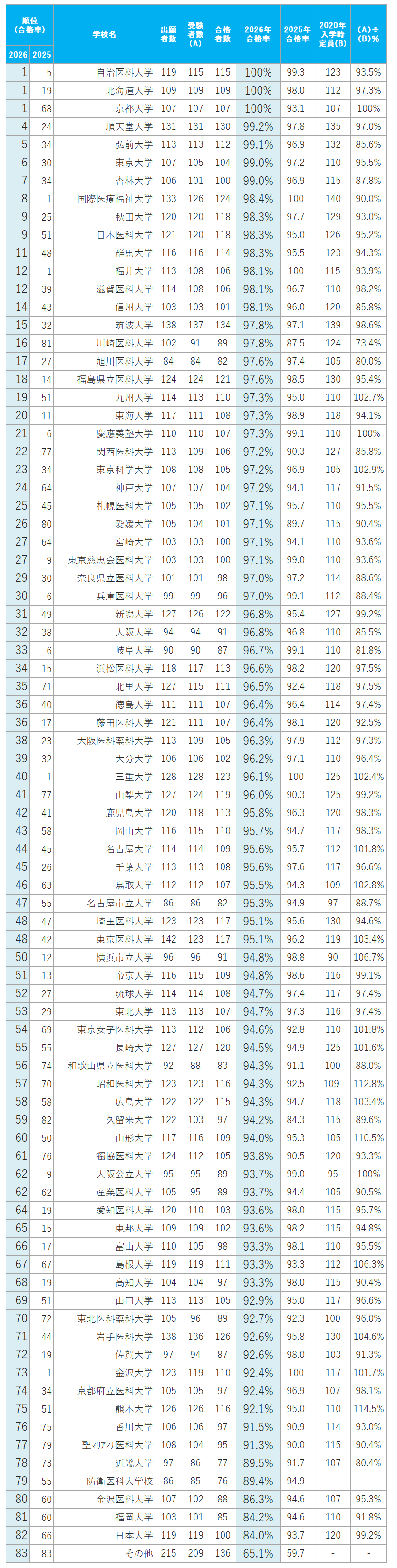 医師国試受験資格認定制度では、出願者が317人(新卒193人)、受験者が309人(同187人)、合格者が169人(同121人)で、合格率は54.7%(同64.7%)だった。医師国試予備試験受験資格認定では出願者34人(同22人)、受験者が34人(同22人)、合格者19人(同15人)で合格率は55.9%(同68.2%)だった。