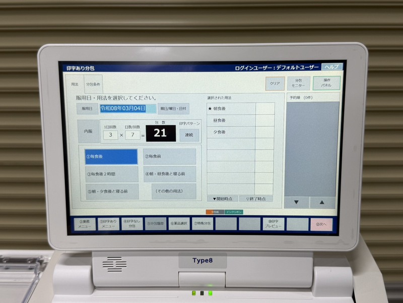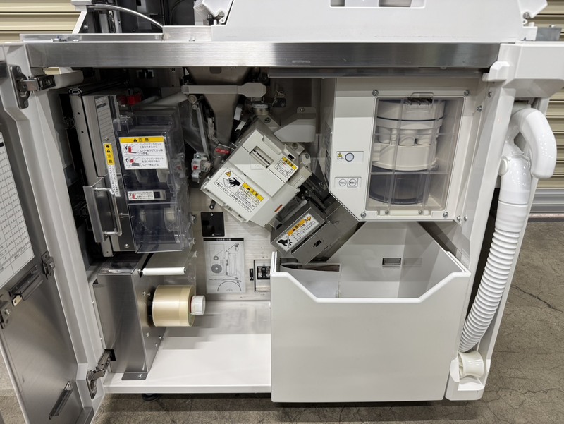 分包数:散剤 1~93包(最大入力包数は999包) 錠剤 1~999包 投入ホッパー:2個 フィーダー数:2個 円盤数:1枚 錠剤ホール数:48マス 使用電源:AC100V±10V:50/60Hz 消費電力:MAX1,180VA(MAX1,090W) 外形寸法:幅772×奥行584×高さ1,008mm 本体質量:約127kg